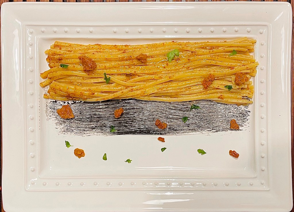 Come vedete si tratta della base di aglio e olio e peperoncino col riccio che sostituisce il peperoncino appunto…questo ci fa capire che se ne possono fare tantissime varianti, giocando un po’ con gli ingredienti per ottenere oltre che un gusto fantastico anche un aspetto visivo davvero da ristorante gourmet.